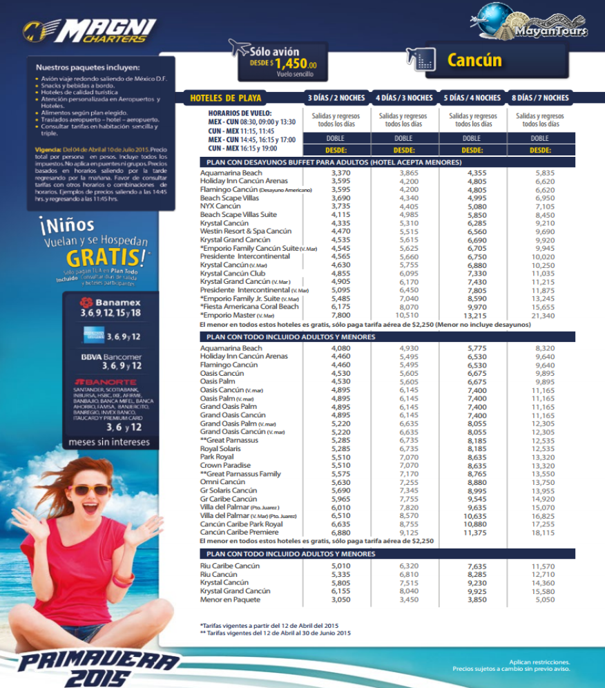 Magnicharters -2015 -20151999-1697 8590-7561 5601-1493 Precio por persona, menor Vuela Gratis consultar fechas y hoteles participantes Las tarifas publicadas son por persona (no aplica puentes,dias festivos