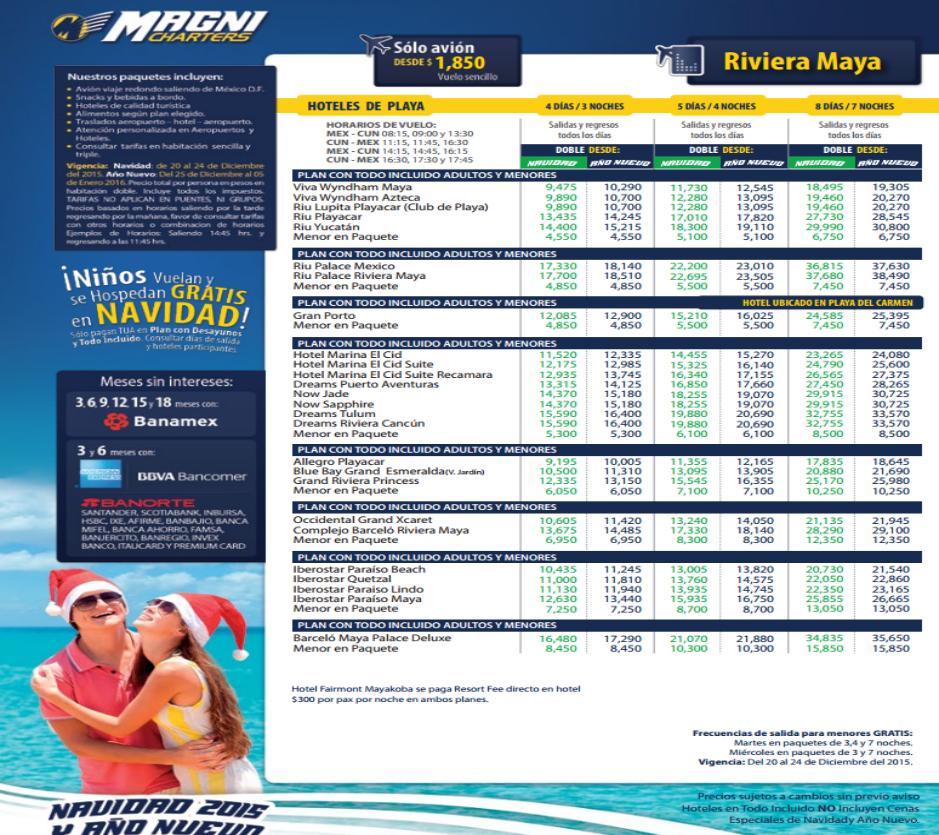 Magnicharters -2015 2016-20131999-1697 8590-7561 5601-1493 Precio por persona, menor Vuela Gratis consultar fechas y hoteles participantes Las tarifas publicadas son por persona (no aplica puentes,dias festivos ULTIMA SALIDA DE TARIFA MENOR GRATIS NOV 28