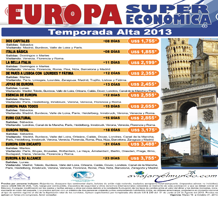 "LOS CIRCUITOS DE EUROPA" INCLUYEN:*AVION VIAJE REDONDO EN CATEGORIA ESPECIAL CAPACIDAD CONTROLADA POR LA LINEA AEREA, OTRAS CLASES FAVOR DE CONSULTAR SUPLEMENTO Y DISPONIBILIDAD *ALOJAMIENTO EN HOTELES SELECCIONADOS,*TRASLADOS APTO-HOTEL (EXCPTO DONDE SE INDIQUE LO CONTRARIO),*PRECIOS POR PERSONA BASE COUPACION DOBLE precios mas impuestos desde 444 usd Vigencia 1 de Abril al 15 de Octubre TEMPORADA ALTA APLICA SUPLEMENTO desde 225 usd del 1 de Junio al 23 de Agosto