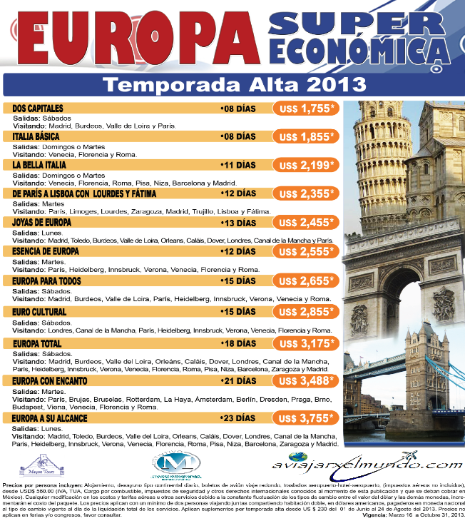 Contactanos para Informes y Reservaciones a Europa solicita el Itinerario de "Circuitos y Viajes a Europa"