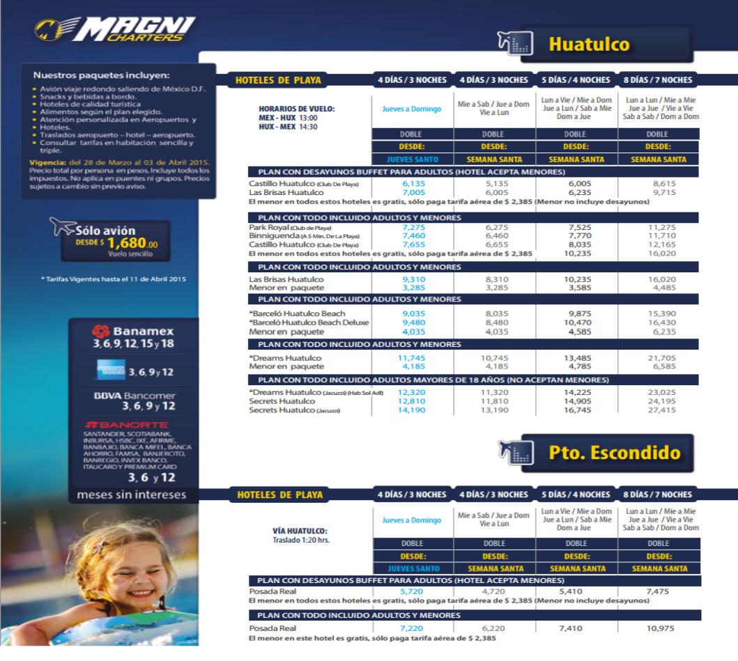 | Magnicharters -2014 -20131999-1697 8590-7561 5601-1493 Precio por persona Las tarifas publicadas son por persona (no aplica puentes,dias festivos ULTIMA SALIDA DE TARIFA MENOR GRATIS NOV 28 |