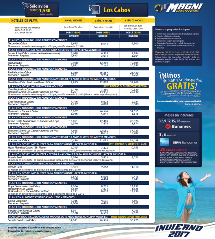 | Magnicharters -2017 -2015 1999-1697 8590-7561 5601-1493 Precio por persona, menor Vuela Gratis consultar fechas y hoteles participantes Las tarifas publicadas son por persona (no aplica puentes,dias festivos vigencia del 1 de Enero al 7 de Abril 2017 |