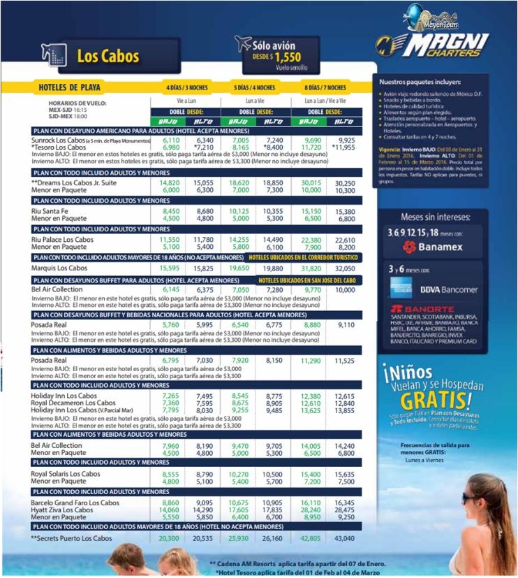 | Magnicharters -2015 -2015 1999-1697 8590-7561 5601-1493 Precio por persona, menor Vuela Gratis consultar fechas y hoteles participantes Las tarifas publicadas son por persona (no aplica puentes,dias festivos vigencia al 31 de Enero 2016 (invierno bajo) vigencia 1 de Febrero a 15 de Marzo 2016 (Invierno Alto) |