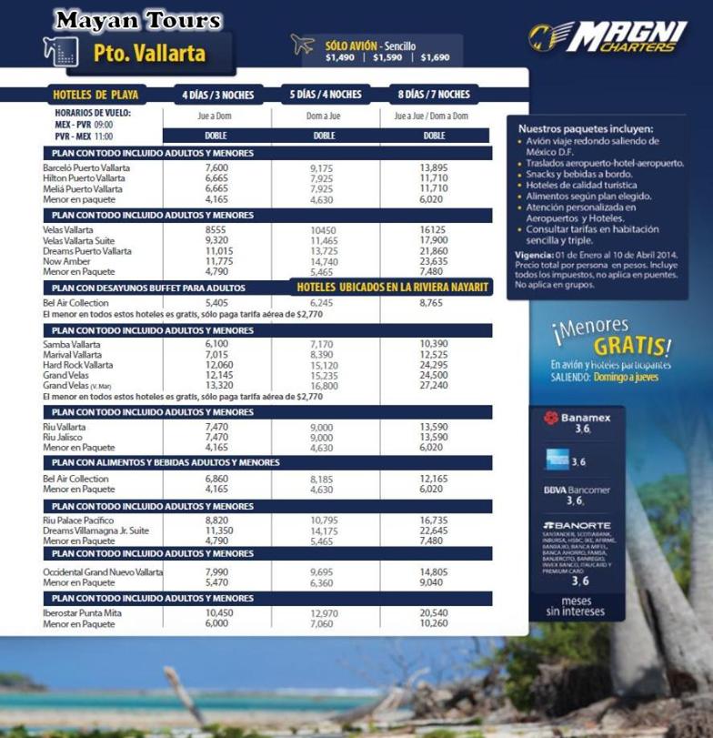 | Magnicharters -2014 -20131999-1697 8590-7561 5601-1493 Precio por persona, menor Vuela Gratis consultar fechas y hteles participantes Las tarifas publicadas son por persona (no aplica puentes,dias festivos ULTIMA SALIDA DE TARIFA MENOR GRATIS NOV 28 |